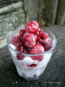 A karácsonyi apró süti gyártásban nem árt egy szusszanásnyi levegőt venni, nehogy "sütiundort " kapjunk. Tartottam egy sütimente napot: a fagyasztóban mindig lapul télire eltett málna, ebből készítettem ezt a selymesen kényeztető, frissítő finomságot. Az eredeti ötlet Stahl Judittól származik, ő használt hozzá. Mivel nálunk az a fő kedvenc, hamar kiettük a mélyhűtőből, ezért - kizárásos alapon - maradt a málna. Amúgy ezzel is nagyon-nagyon finom. :-))) Amit szerintem még érdemes kipróbálni az az erdei gyümölcsös, áfonyás, esetleg szedres, szamócás változata...